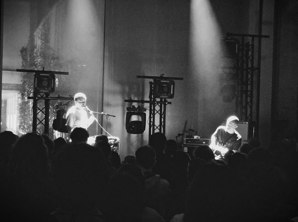 Si, plus tard, les arpèges de guitare électrique joués par la gauchère Valentina Magaletti sonnèrent trop aigus et métalliques, et ses accords de clavier façon orgue électrique trop évidents en face de rythmiques réverbérées, le concert navigua entre post-punk (ces rythmiques heurtées et cette basse bien ronde) et électronique, escorté par des stroboscopes et autres lumières clignotantes, venues en appui des morceaux aux pulsations syncopées. Pour finir, la guitare de l’Italienne dialogua avec la basse de Zongamin sur Candles (Version), dans un beau format proche de la ballade, soutenu par pulsations régulières, avec quelques vocalises de la jeune femme, afin de finir de se convaincre que la soirée était bien allée crescendo en qualité.